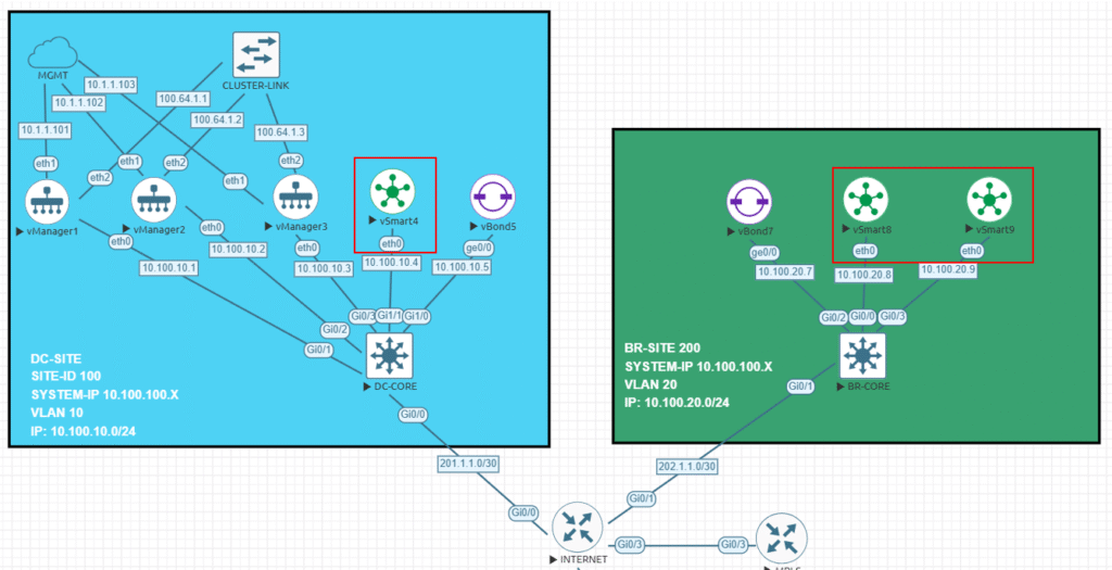 As we might know, the controller is in charge of the control plane in our SD-WAN environment working quite similar of how a route reflector will work, but with more capabilities like the applications of policies, distribute prefixes using OMP, enhanced security and so on, basically it works like the brain for our SD-WAN platform. As we have been doing in the previous post, all three Controllers will be deployed in different locations, as you can see highlighted in red below, this will bring us a geo-redundancy solution to our HA solution.