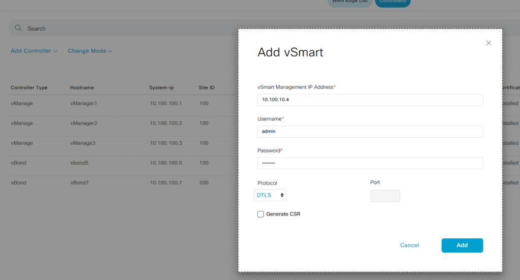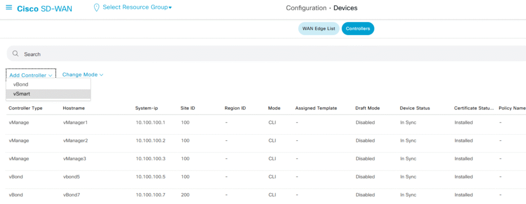 Configuration > Devices > Controllers > Add Controller > vSmart