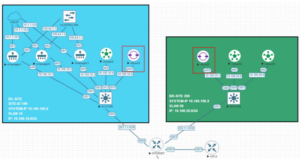 By deploying the two vBond devices in separate locations, we will have s some sort of geo-redundancy HA setup, in red you will find where are located physically these two devices in my topology.