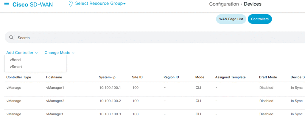 In order to add these two new devices, we just need to go to the Configuration > Devices > Controllers tab, then select the Add Controller using the drop-down menu and select the vBond option