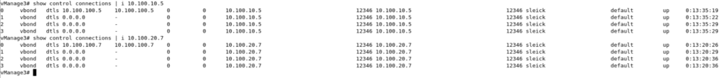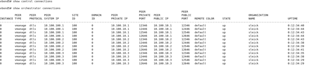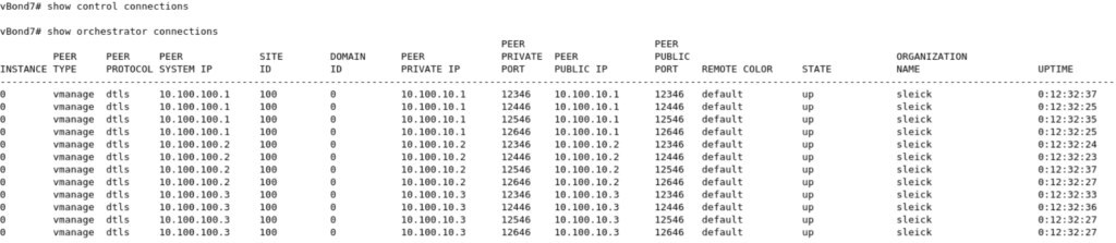 With all three managers and two new vBonds up and running in our environment, is time to see what is happening behind the scenes, first of all I will take a look at the two new vBonds. Something important that I need to mention is if you use normal show control connections under the vBond CLI, nothing will be displayed, we need to add the key word orchestrator to our show commands